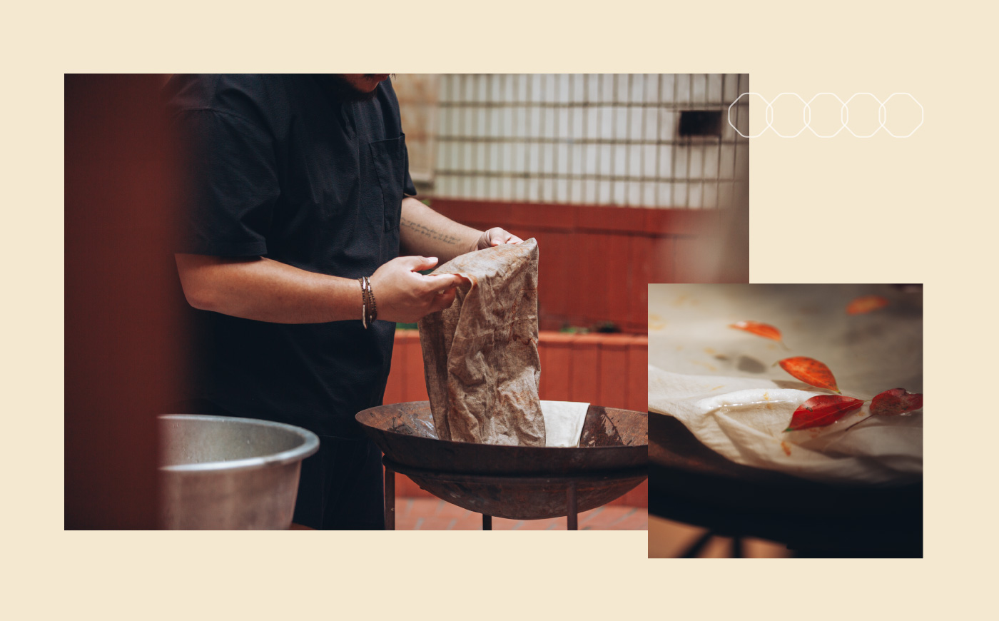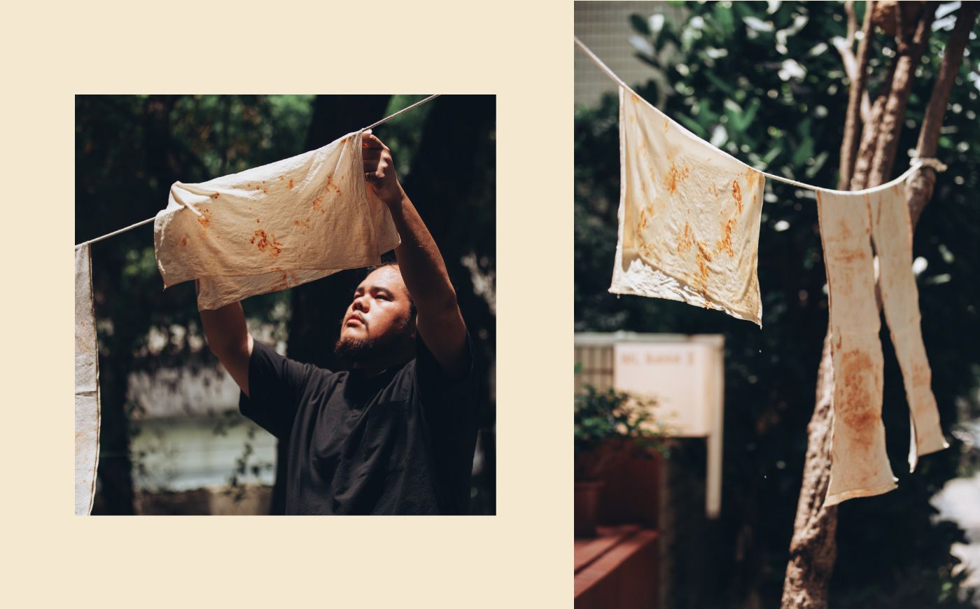 接著把布料放入鐵鏽與水交融的環境,任由時間緩緩雕刻顏色,一點一點滲進纖維的縫隙。鏽味帶著微微的金屬氣息,混著濕潤泥土的味道,像雨後庭院,安靜卻充滿生命感。