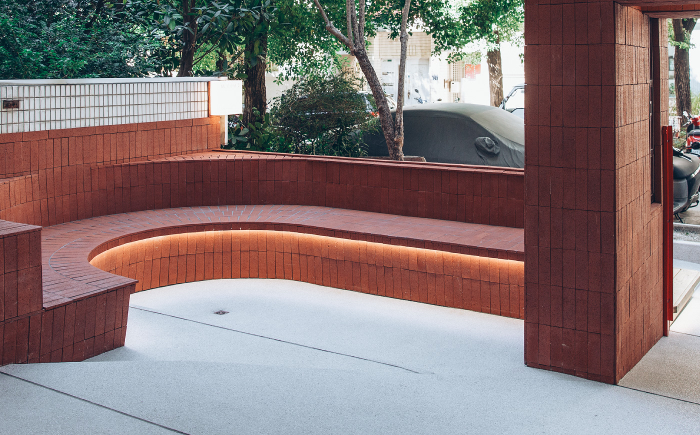 老宅改建的小庭院特別使用了大量紅磚,營造復古懷舊感覺,不只在這條街上很引人注目,讓人想進來 一探究竟。 紅磚圍成了一個座位區,很適合一群人圍坐在這聊天玩耍,讓人想到特別適合中秋節烤肉呢!妮妮布魯 覺得黑色小白兔很貼心有注意到細節,在階梯中特別設置了平緩的無障礙坡道,不管是推嬰兒車或輪椅 都太方便了!
