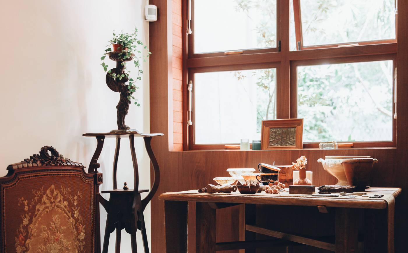 帶有歷史感的老物件在沉穩香氣與頌缽音樂中更像是時間停滯了一般,讓人走進來這區就忍不住小聲
